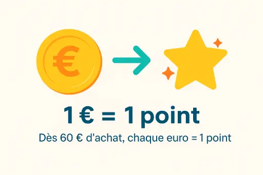 Seuil minimal de 60,00 € ; si la commande atteint au moins 60,00 €, vous recevez 1 point par euro du montant de la commande (les centimes ne donnent pas de points). Exemples : 65,00 € → 65 points / 65,90 € → 65 points / 59,99 € → 0 point.